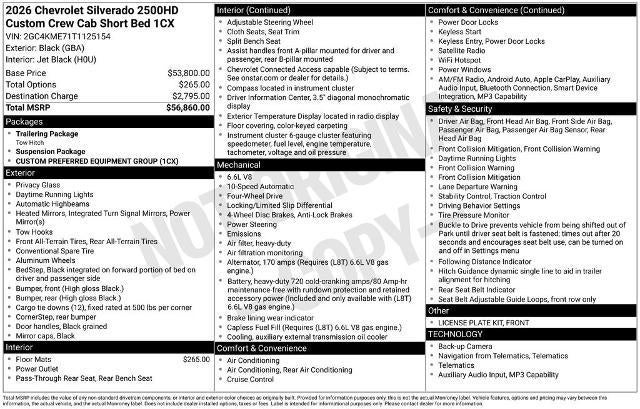 Whether you're a seasoned contractor, an avid outdoor enthusiast, or simply in need of a capable and versatile truck, this 2026 Chevrolet Silverado 2500HD Custom is an exceptional choice. Experience the power, capability, and technology that make this Silverado stand out from the crowd.