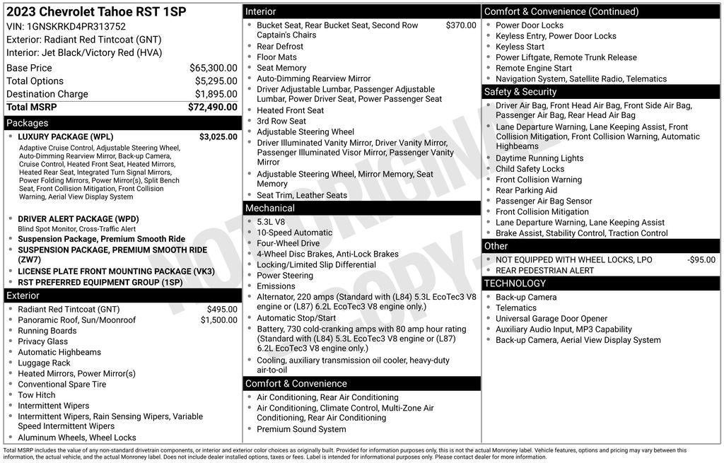 Introducing the 2023 Chevrolet Tahoe RST - a commanding SUV that blends uncompromising capability with refined luxury. This stunning Red Tahoe is equipped with an impressive EcoTec3 5.3L V8 engine, mated to a responsive 10-Speed Automatic transmission, and a capable 4WD system, delivering the power and performance you demand.